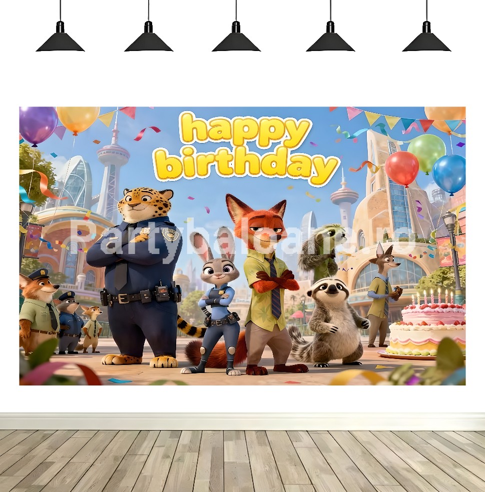 Adu metropola animalelor, Zootropolis, direct la petrecerea copilului tău! Acest fundal foto textil cu tematică Zootopia îi aduce în prim-plan pe îndrăgita polițistă Judy Hopps și pe șiretului vulpoi Nick Wilde. Cu textul „Happy Birthday” scris cu litere mari, este decorul perfect pentru o aniversare reușită în universul Zootopia.
