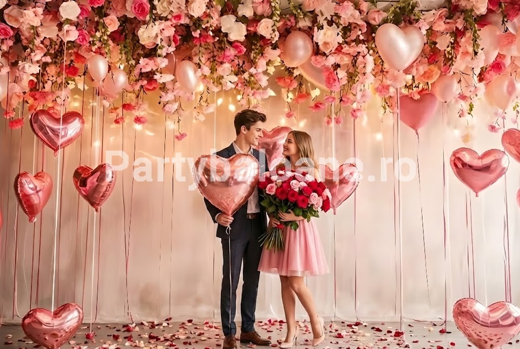 Transformă orice eveniment într-o sărbătoare a iubirii cu acest fundal foto textil spectaculos. Designul luxuriant, care combină un baldachin bogat de flori în nuanțe de roz și crem cu baloane metalice în formă de inimă, creează cadrul perfect pentru fotografii romantice și elegante.