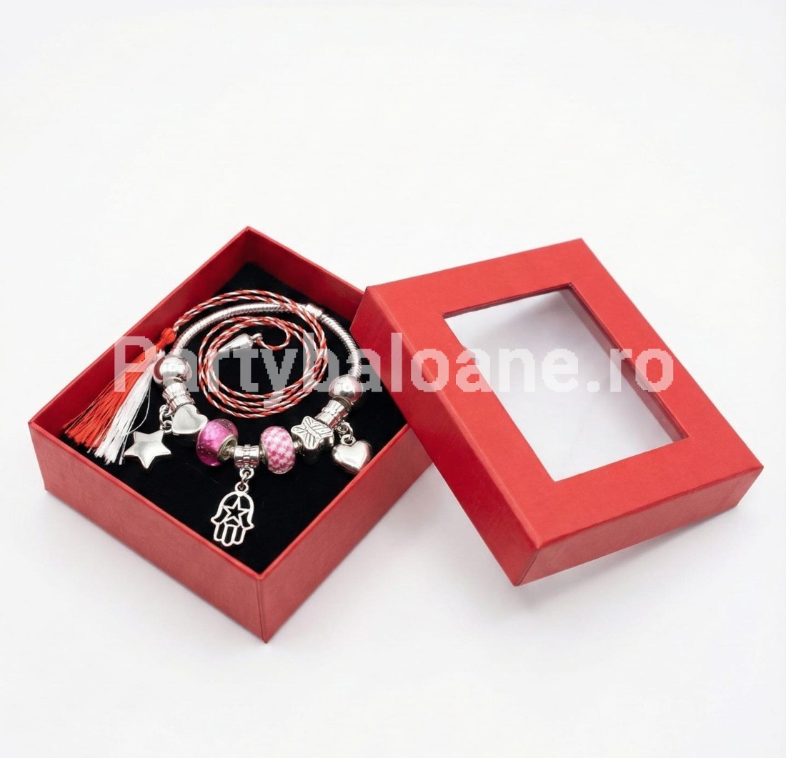 Ambalaj inclus: Cutie roșie de prezentare cu fereastră și suport de catifea, șnur de mărțișor cu ciucure.