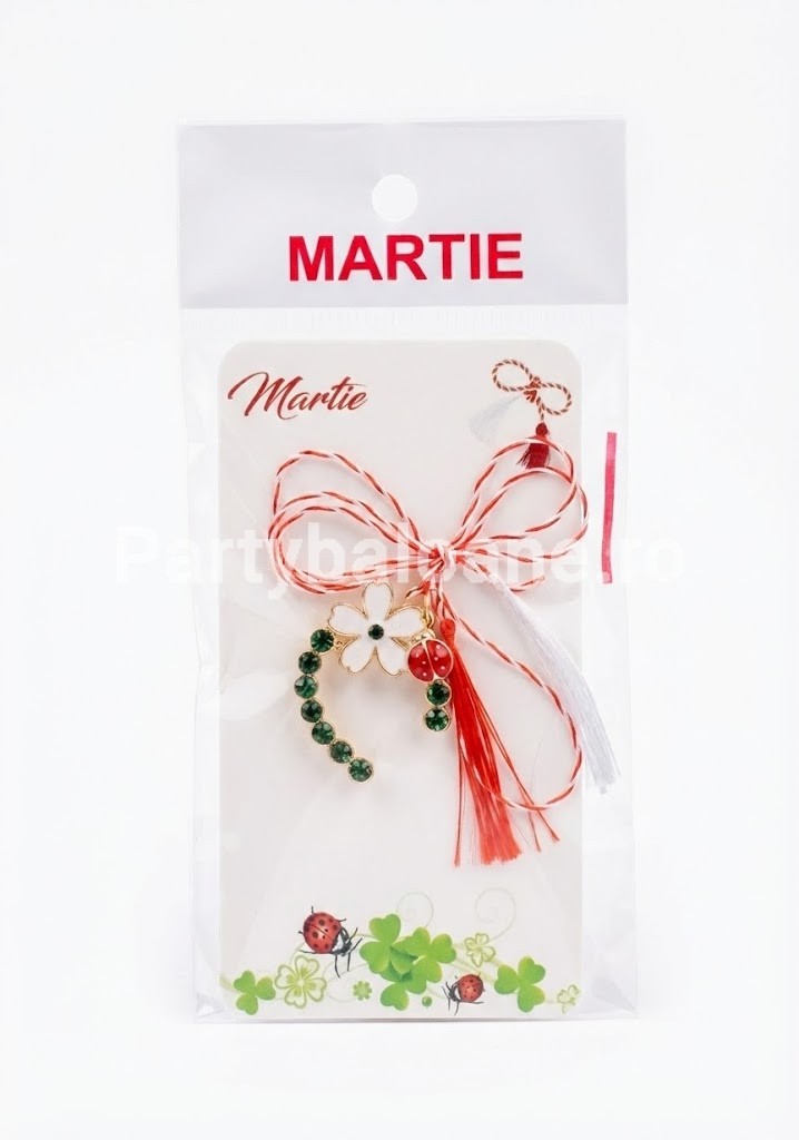 Prezentare Clasică și Practică Fiecare produs este ambalat individual, gata de a fi oferit. Figurina este prinsă pe un cartonaș decorativ cu motive de primăvară (trifoi, buburuze) și textul „Martie”, având atașat clasicul șnur alb-roșu cu ciucuri. Totul este protejat de o punguliță transparentă, asigurând o prezentare igienică și îngrijită.