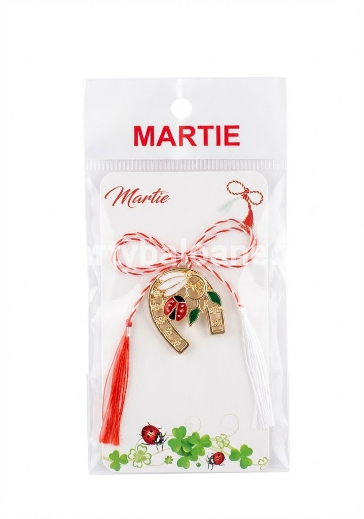 Prezentare Clasică și Practică Fiecare produs este ambalat individual, gata de a fi oferit. Figurina este prinsă pe un cartonaș decorativ cu motive de primăvară (trifoi, buburuze) și textul „Martie”, având atașat clasicul șnur alb-roșu cu ciucuri. Totul este protejat de o punguliță transparentă, asigurând o prezentare igienică și îngrijită.