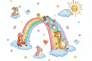Pentru părinți, acest sticker reprezintă o modalitate simplă de a crea un mediu educativ și plăcut pentru copii. Animalele ilustrate pot fi folosite ca punct de pornire pentru povești sau jocuri, stimulând imaginația celor mici. În același timp, curcubeul colorat transmite un mesaj de speranță și pozitivitate, fiind un simbol universal al bucuriei.