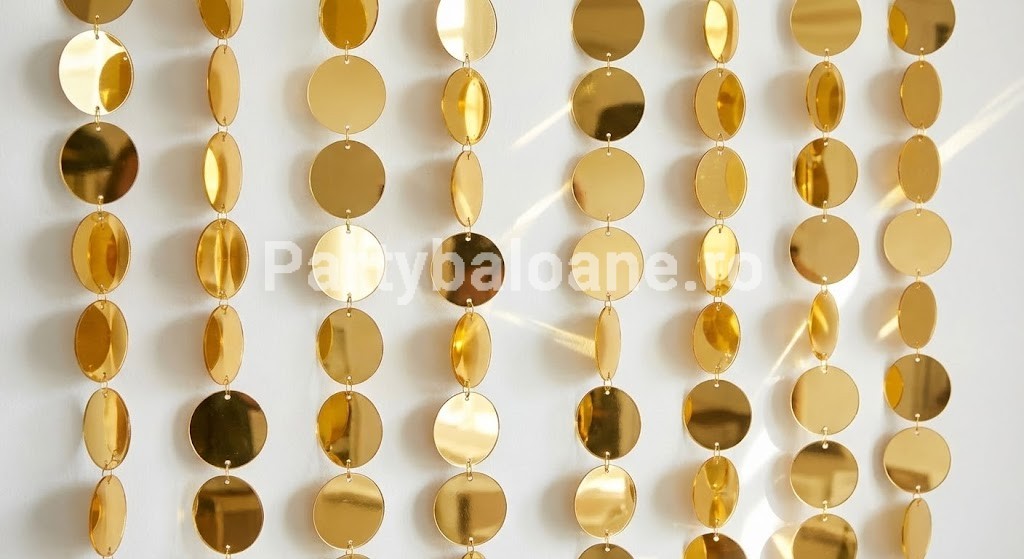 Ceea ce face acest banner cu adevărat special este alternanța texturilor. Ghirlanda este compusă din cercuri cu efect oglindă (metalic) care reflectă lumina. Această combinație creează un joc de lumini dinamic și sofisticat, oferind un aspect de lux decorului tău, fără a fi nevoie de investiții majore.