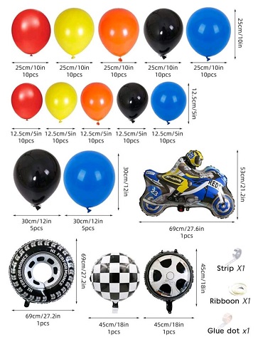 CHIT GHIRLANDA BALOANE TEMATICA RACING SETUL CONTINE BANDA FLEXIBILA DIN PLASTIC PENTRU FORMAREA GHIRLANDEI 5 METRI BULINE DUBLU ADEZIVE MOTOCICLETA FOLIE 69×53 CM ROATA FOLIE 69 CM 2 BALOANE FOLIE ROTUNDE 45 CM 110 BALOANE LATEX DE DIFERITE DIMENSIUNI – ROSU , GALBEN , PORTOCALIU , NEGRU , ALBASTRU Modalitate de asamblare a arcadei: Pentru inceput recomandam achizitionarea unei pompe manuale sau electrice pentru umflarea mai rapida a baloanelor,in cazul in care nu aveti deja una in dotare. Baloanele se umfla de dimensiuni variabile(nu trebuie umflate la aceeasi dimensiune pentru a putea obtine efectul unei arcade asimetrice).Baloanele se prind pe banda de arcada care este prevazuta cu niste orificii rotunde prin care puteti baga baloanele dupa ce le legati.Ca si modalitate de prindere a arcadei,recomandam 2 feluri.Prima este cea prin care dupa umflarea baloanelor ,luati un balon il bagati printr-un orificiu si la capatul opus (in spatele benzii) prindeti alt balon.Continuati in acest mod pana cand arcada este plina.Al doilea mod este acele prin care dupa ce a-ti umflat baloanele,le prindeti 2 cate 2,dupa care un set de doua baloane il introduceti prin orificiul benzii de arcada iar in spate prindeti alte doua baloane.Continuati asa pana arcada se va umple. Dupa ce ati terminat de facut arcada, trebuie sa o agatati de partea de sus si de jos, iar pentru a face curba arcadei va trebui sa o mai legati si in punctul in care doriti sa se indoaie. GHIRLANDA SE LIVREAZA NEUMFLATA