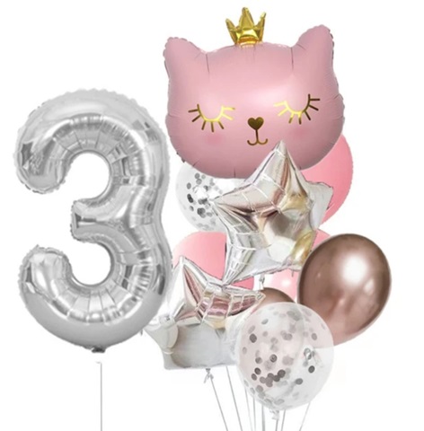 Set 11 baloane folie si latex cu cifra 3 – Pisica roz