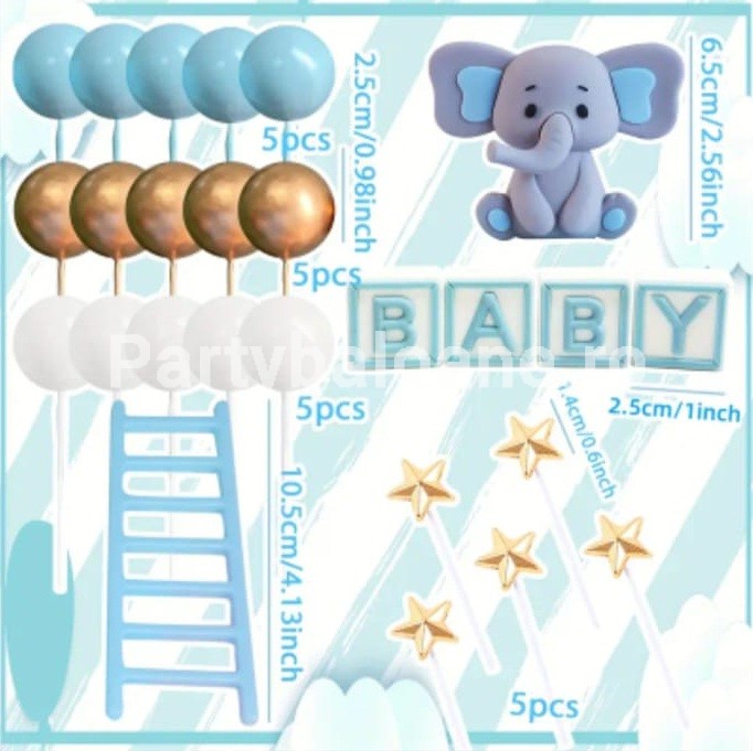 SET 26 DE TOPPERE 3D PENTRU TORT CU ELEFANT , BILE , CUBURI BABY , SCARA – TOP 152 MATERIAL – BILE SI STELE PLASTIC CU TIJA METALICA ELEFANT DIN PLASTIC MODEL 3D SCARA SI CUBURI 3D DIN PLASTIC SETUL INCLUDE 5 BILE BLEU CU DIAMETRUL DE 2,5 CM 5 BILE ALBE CU DIAMETRUL DE 2,5 CM 5 BILE AURII CU DIAMETRUL DE 2,5 CM SCARA 10,5 CM 4 CUBURI BABY 2,5 CM ELEFANT 6,5 CM
