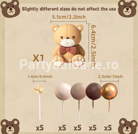 SET 26 TOPPERE 3D PENTRU TORT – URS ,BILE , STELE – TOP26 MATERIAL – BILE PLASTIC CU TIJA METALICA URS SI STELE – PLASTIC MODEL 3D SETUL INCLUDE 5 BILE MARO CU DIAMETRUL DE 2,5 CM 5 BILE CREM CU DIAMETRUL DE 2,5 CM 5 BILE BEJ CU DIAMETRUL DE 2,5 CM 5 BILE AURII CU DIAMETRUL DE 2,5 CM CULORI BILE – AURIU , MARO , CREM , BEJ URS 3D – 6,4 CM x 5,5 CM x 3,5 CM 5 STELE AURII CU TIJA 1,5 CM