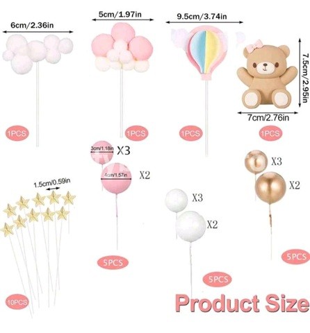 SET 29 DE TOPPERE 3D PENTRU TORT CU URS ROZ , BILE , NORI , STELUTE TOP 92 MATERIAL – BILE SI STELE PLASTIC CU TIJA METALICA SI NORI DIN POMPON URS DIN PLASTIC MODEL 3D SETUL INCLUDE 3 BILE ROZ CU DIAMETRUL DE 3 CM 2 BILE ALBE CU DIAMETRUL DE 4 CM 3 BILE ALBE CU DIAMETRUL DE 3 CM 2 BILE ALBE CU DIAMETRUL DE 4 CM 3 BILE AURII CU DIAMETRUL DE 3 CM 2 BILE AURII CU DIAMETRUL DE 4 CM 10 STELUTE AURII 1,5 CM NOR 6 CM NOR 5 CM URS 7 CM x 7.5 CM BALON CU AER CALD 9,5 CM – CARTON