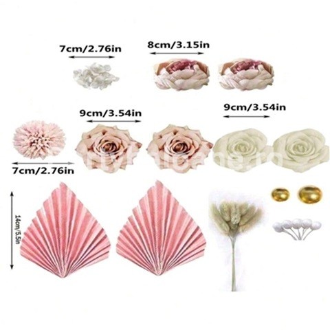 SET 32 TOPPERE 3D PENTRU TORT – FLORI , FRUNZE SI BILE TOP10 MATERIAL – BILE PLASTIC CU TIJA METALICA SI FRUNZE DIN CARTON FLORI ARTIFICIALE MODEL 3D SETUL INCLUDE 10 BILE ALBE CU DIAMETRUL DE 2 CM 2 BILE AURII CU DIAMETRUL DE 2,5 CM 1 FRUNZA EVANTAI ROZ 15 CM x 12 CM 1 FRUNZA EVANTAI ROZ 10 CM x 10 CM 10 TIJE TIP STUF 20 CM 8 FLORI ALB , ROZ , MOV , BEJ CU DIAMETRU INTRE 7 CM SI 9 CM
