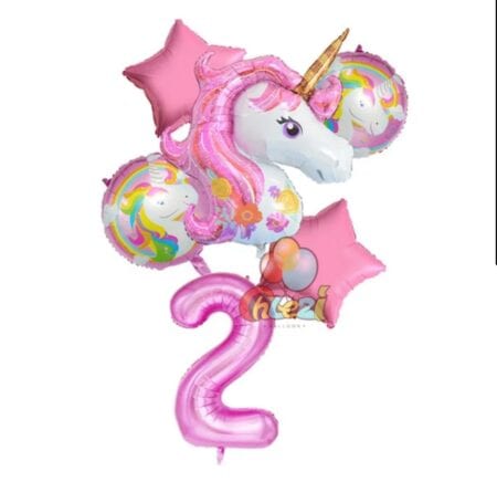 Setul include – balon cifra – 100 cm – unicorn 117 cm – 2 baloane rotunde 45 cm – 2 stelute 45 cm Baloanele se livreaza neumflate Se pot umfla și cu heliu dar și cu aer