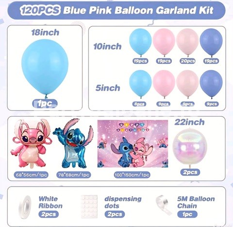 SET GHIRLANDA CU BALOANE SI BACKGROUND TEXTIL – STITCH SI LILO Setul contine ROLA FLEXIBILA DIN PLASTIC PENTRU FORMAREA GHIRLANDEI – 5 METRI LUNGIME BULINE ADEZIVE RAFIE PENTRU LEGAT BALOANELE 113 baloane latex 45 CM , 26 CM SI 12 CM 1 balon folie personaj 68×56 cm 1 balon folie personaj 78×68 cm 2 baloane folie rotunde orbz 55 cm BACKGROUND TEXTIL PENTRU ARANJAMENT – 150 CM x 100 CM Modalitate de asamblare a arcadei: Pentru inceput recomandam achizitionarea unei pompe manuale sau electrice pentru umflarea mai rapida a baloanelor,in cazul in care nu aveti deja una in dotare. Baloanele se umfla de dimensiuni variabile(nu trebuie umflate la aceeasi dimensiune pentru a putea obtine efectul unei arcade asimetrice).Baloanele se prind pe banda de arcada care este prevazuta cu niste orificii rotunde prin care puteti baga baloanele dupa ce le legati.Ca si modalitate de prindere a arcadei,recomandam 2 feluri.Prima este cea prin care dupa umflarea baloanelor ,luati un balon il bagati printr-un orificiu si la capatul opus (in spatele benzii) prindeti alt balon.Continuati in acest mod pana cand arcada este plina.Al doilea mod este acele prin care dupa ce a-ti umflat baloanele,le prindeti 2 cate 2,dupa care un set de doua baloane il introduceti prin orificiul benzii de arcada iar in spate prindeti alte doua baloane.Continuati asa pana arcada se va umple. Dupa ce ati terminat de facut arcada, trebuie sa o agatati de partea de sus si de jos, iar pentru a face curba arcadei va trebui sa o mai legati si in punctul in care doriti sa se indoaie. IMAGINEA ESTE DOAR DE PREZENTARE. ARCADA SE EXPEDIAZA NEUMFLATA.