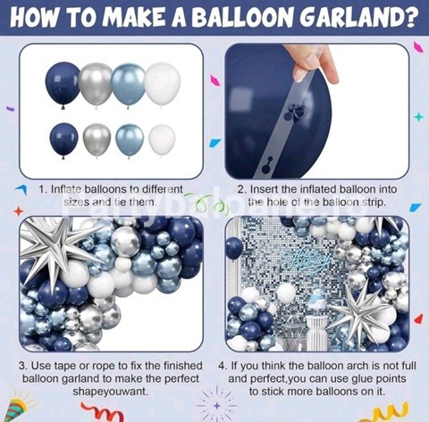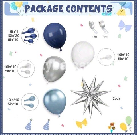 Setul ghirlanda baloane include Banda flexibila din PLASTIC TRANSPARENT  pentru arcada – 5 metri lungime BULINE ADEZIVE 91 BALOANE ARGINTIU CHROME , BLEU CHROME , BLEUMARIN , ALB DE DIFERITE DIMENSIUNI 12 CM , 25 CM , 45 CM 2 BALOANE FOLIE STEA 4D 55 CM