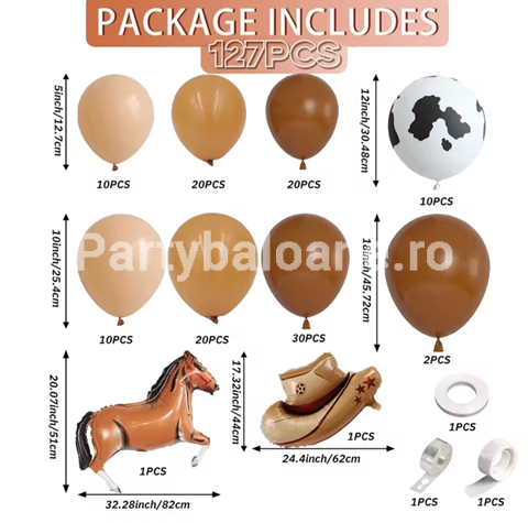 Setul ghirlanda baloane include Banda flexibila din PLASTIC TRANSPARENT  pentru arcada – 5 metri lungime BULINE ADEZIVE 122 BALOANE BEJ, MARO , ALB CU IMPRIMEU , MARO RETRO DE DIFERITE DIMENSIUNI – 26 CM ,30 CM, 13 CM CAL 82×51 CM PALARIE 62×44 CM
