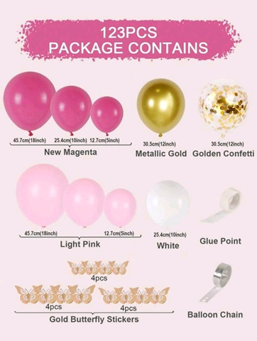 Setul ghirlanda baloane include Banda flexibila din PLASTIC TRANSPARENT  pentru arcada – 5 metri lungime BULINE ADEZIVE 107 BALOANE IN NUANTE DE ALB , AURIU CHROME , FUCSIA,ROZ MACARONS , TRANSPARENTE CU CONFETTI AURII  DE DIFERITE DIMENSIUNI – 45 CM ,26 CM , 14 CM 12 FLUTURI ADEZIVI AURII