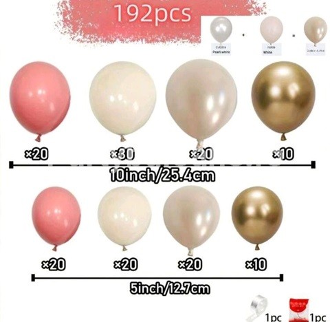 Setul ghirlanda baloane include Banda flexibila din PLASTIC TRANSPARENT  pentru arcada – 5 metri lungime BULINE ADEZIVE 150 BALOANE ROZ RETRO , SAND WHITE , AURIU CHROME, ALB , ALB SIDEFAT DE DIFERITE DIMENSIUNI – 26 CM ,30 CM, 14 CM ANUMITE BALOANE SUNT DUBLATE , SE UMFLA SI SE FACE NOD DOAR BALONULUI DIN INTERIOR .