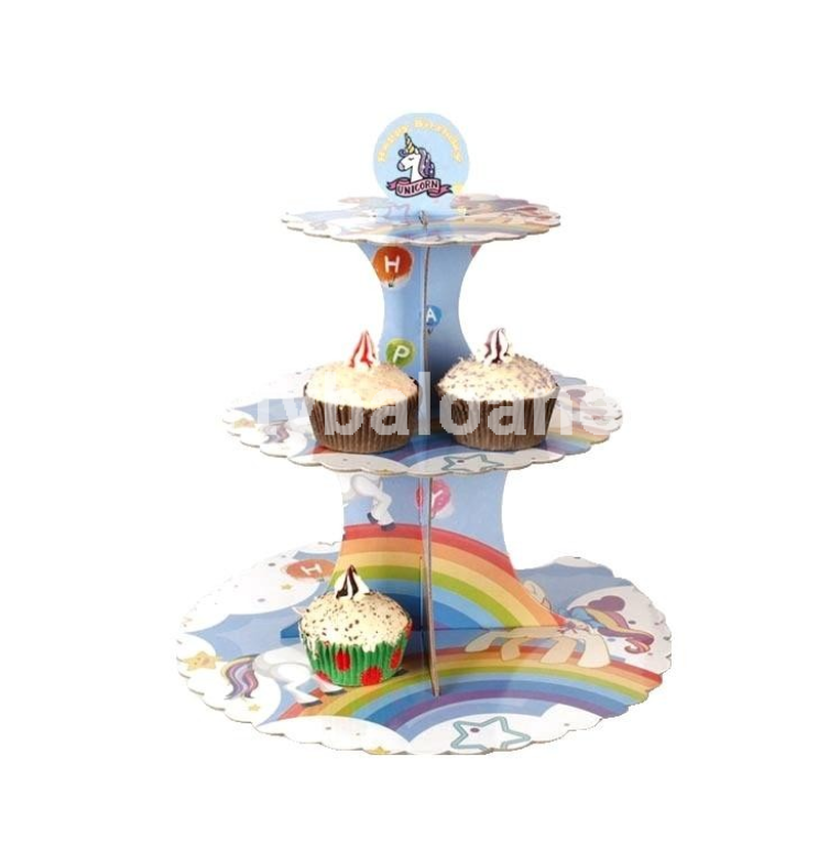Există ceva mai magic decât o petrecere cu Unicorni? Dacă micuța ta visează la o lume fantastică, plină de culori pastelate, sclipici și creaturi de basm, atunci decorul mesei trebuie să fie pe măsură. Suportul Etajat pentru Prăjituri cu Tematica Unicorni și Curcubeu este piesa centrală care transformă orice Candy Bar într-un colț de rai dulce.