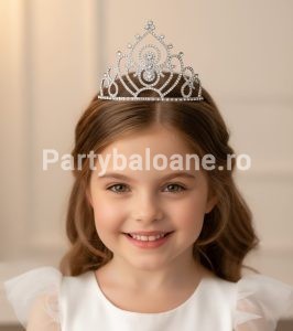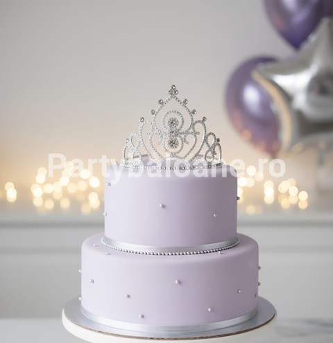 Transformă orice tort într-o adevărată operă regală cu această coroniță argintie din metal, decorată cu cristale și strasuri strălucitoare. Cu un design elegant și dimensiuni generoase (14 cm diametru și 10 cm înălțime), este accesoriul perfect pentru torturi aniversare, botezuri, nunți sau petreceri tematice.