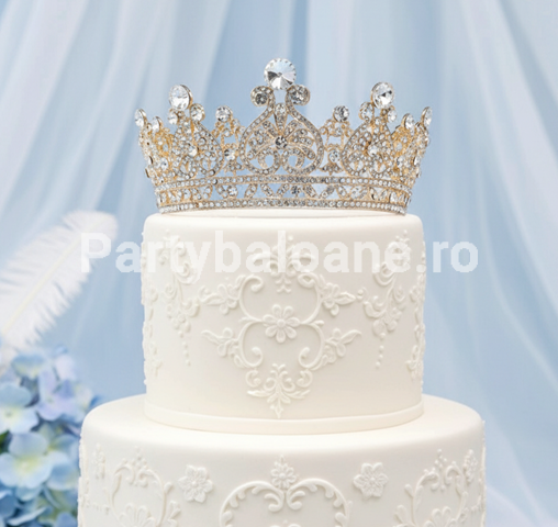 Transformă orice tort într-o adevărată operă regală cu această coroniță aurie din metal, decorată cu cristale și strasuri strălucitoare. Cu un design elegant și dimensiuni generoase (16 cm diametru și 7 cm înălțime), este accesoriul perfect pentru torturi aniversare, botezuri, nunți sau petreceri tematice.